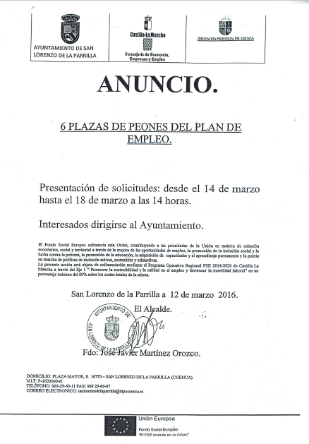 Ayuntamiento San Lorenzo de la Parrilla2016-04-01T10:41:07+00:00El Ayuntamiento de San Lorenzo de la Parrilla ha puesto en marcha el Plan Extraordinario de Empleo 2016. Uno de los ejes de este Plan [...]