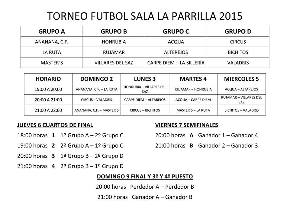 Horarios Fútbol Sala Aquí tenéis los horarios de todos los partidos de fútbol sala y de todas las categorías. My Review Review Form... Reviews Loading Reviews... Ayuntamiento San Lorenzo de la Parrilla2015-08-04T10:04:09+00:00