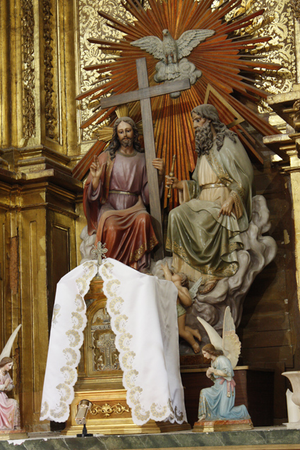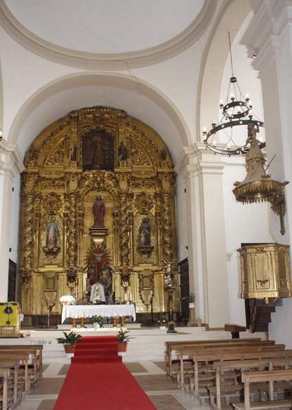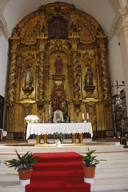Destaca sobre el conjunto la cabecera con un gran retablo mayor de carácter arquitectónico, datado en 1750. Distribuido en tres calles por medio de columnas salomónicas, la madera dorada está delicadamente labrada. Cargado de decoración con motivos vegetales, se enmarca la Santísima Trinidad y la imagen de San Pedro y a ambos lados, San José con el Niño y la Inmaculada, empleando para estas imágenes madera policromada. Rematando el conjunto, destaca la pintura al temple de San Lorenzo.
